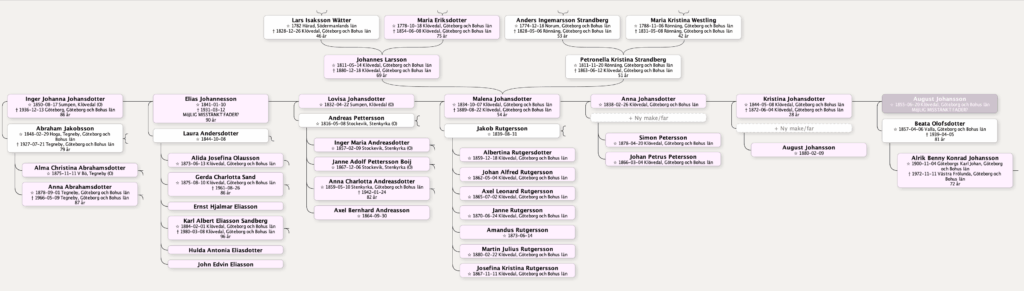 Jag vet inte hur vanligt eller ovanligt det är att man kan belägga alla sina släktingar med DNA ur ett bredare perspektiv. Hur många på 1800-talet får ättlingar som lever idag och DNA-testat sig? Tittar jag i mitt eget släktträd är det många grenar som dör ut efter några generationer. Det är kanske inte så uppseendeväckande om Anna Marias anfäder inte dykt upp ännu i DNA-träfflistan. Jag har haft anledning att gräva lite djupare i det den senaste tiden. Johannes Larsson (f. 1811 i Klövedal) och Petronella Kristina Strandbergs (f. 1811 i Rönnäng) kan nämligen tillhöra Adolf Simon Svenssons fru Anna Karolina Hansen (f. 1875 i Göteborgs Gamlestad).